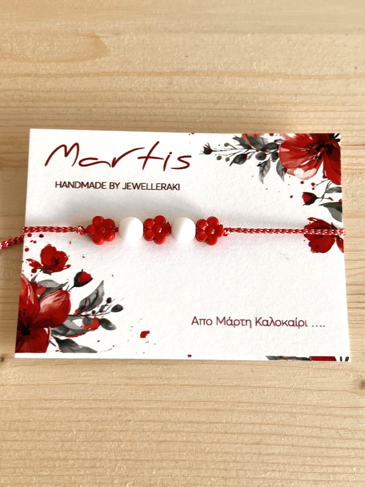 Βραχιόλι χειροποίητο με κόκκινες μαργαρίτες και λευκές χάντρες.