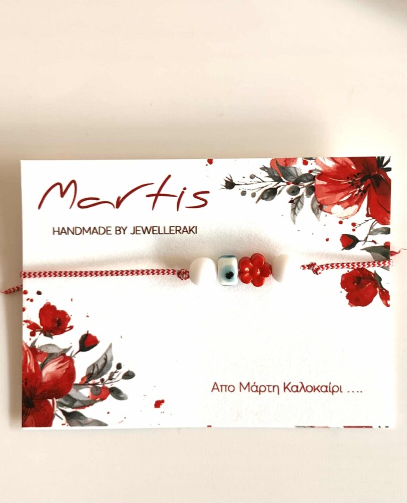 Βραχιόλι χειροποίητο Μάρτης με κόκκινη μαργαρίτα και μπλε χάντρα ματάκι .